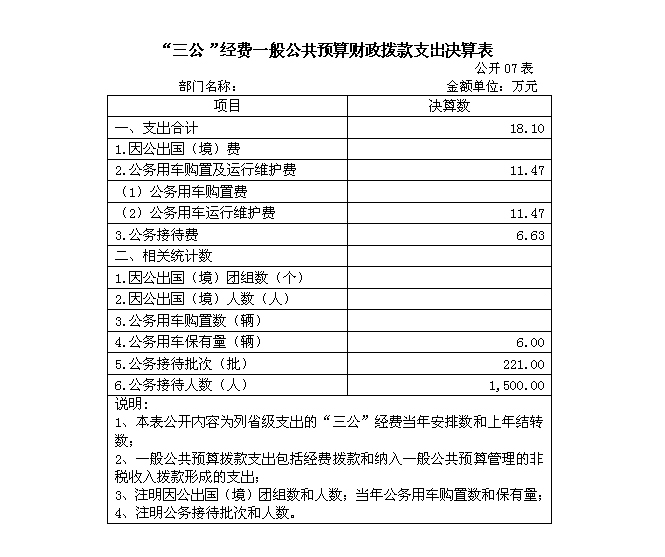 注:按照党中央、国务院有关文件及部门预算管理有关规定,1.“三公”经费包括因公出国(境)费、公务用车购置及运行费和公务接待费。(1)因公出国(境)费,指单位工作人员公务出国(境)的住宿费、旅费、伙食补助费、杂费、培训费等支出。(2)公务用车购置及运行费,指单位公务用车购置费及租用费、燃料费、维修费、过路过桥费、保险费、安全奖励费用等支出,公务用车指用于履行公务的机动车辆,包括领导干部专车、一般公务用车和执法执勤用车。(3)公务接待费,指单位按规定开支的各类公务接待(含外宾接待)支出。2.会议费,指单位在会议期间按照规定开支的住宿费、伙食费、会议室租金、交通费、文件印刷费等支出。3.培训费,指单位组织或参与的各类培训的支出,包括按标准提取的“职工教育经费”也要在统计范围之列。