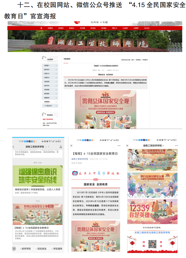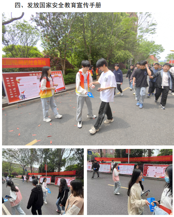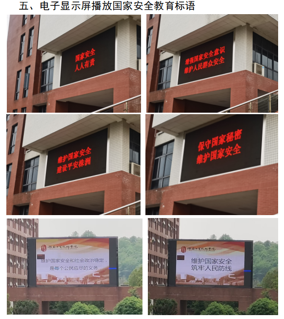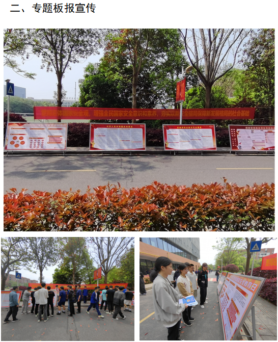 为提高全体学生国家安全意识,根据实施方案的要求开展了专题教育活动。其中:从4月7日开始,连续在米兰买球电子屏滚动播出国家安全宣传标语,在校园广播开设了国家安全教育专栏,在学生保卫处门口、校园食堂、宿舍、教学楼、宣传栏等处摆放了国家安全教育展板或张贴了国家安全宣传海报。4月12日中午,在米兰买球食堂马路组织开展了“贯彻总体国家安全观,增强全民国家安全意识和素养,夯实以新安全格局保障新发展格局的社会基础”签名活动,同时向师生发放了国家安全教育宣传手册。4月12日下午,邀请职教城派出所驻校民警徐闻在阶梯教室开展了国家安全知识讲座。4月12日晚上各班组织召开了“贯彻总体国家安全观,增强全民国家安全意识和素养”主题班会,同时组织全体学生积极参与了“中国普法”微信公众号“4.15”全民国家安全教育日专项答题活动和“反邪教”签名活动。另外,各教学系分别组织开展了国家安全宣传教育黑板报评比活动,并组织学生将国家安全教育情况在微信朋友圈进行分享,扩大了国家安全教育的影响,对提高全社会关注国家安全、主动参与和自觉维护国家安全的意识和能力起到了一定推动作用。