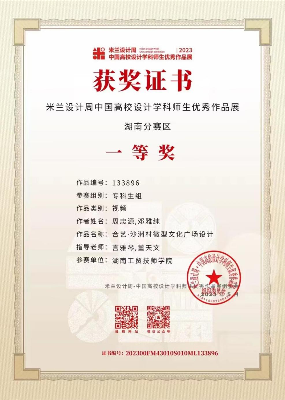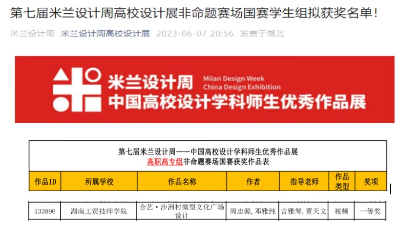 近日,米兰买球建筑装饰系言雅琴、董天文老师指导学生周忠源、邓雅纯创作的作品《合艺·沙洲村微型文化广场设计》在米兰设计周·中国高校设计学科师生优秀作品展活动中脱颖而出,先后获得高职高专组省赛一等奖、国赛一等奖。